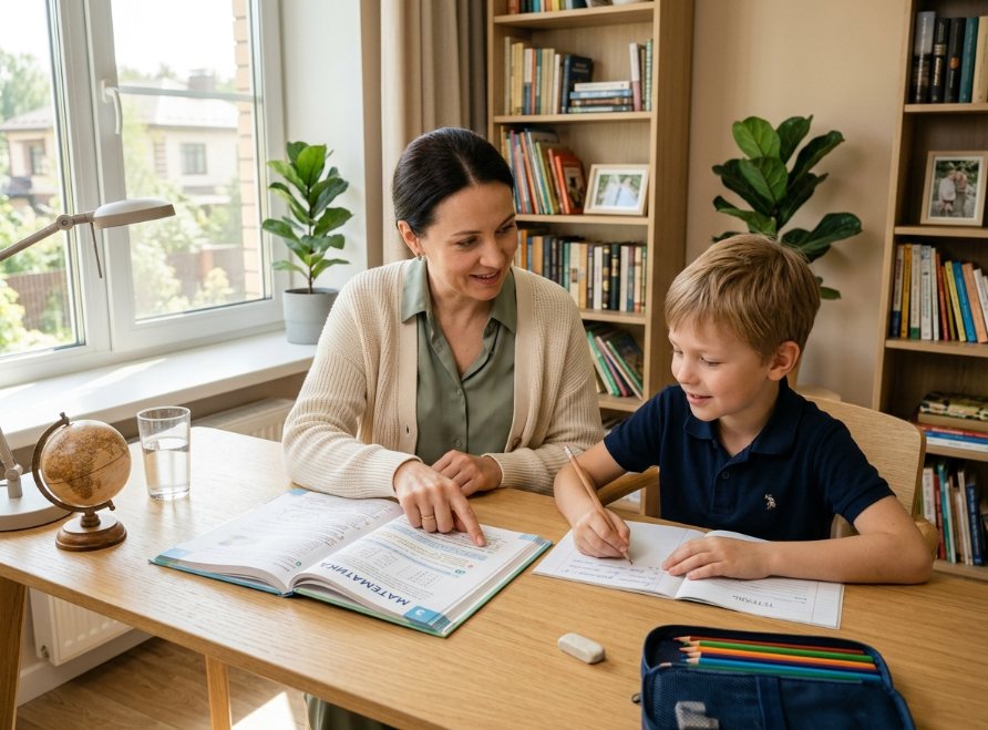 Помощь с домашними заданиями, но не «сделать за него», а научить работать самостоятельно, проверять себя, планировать время.